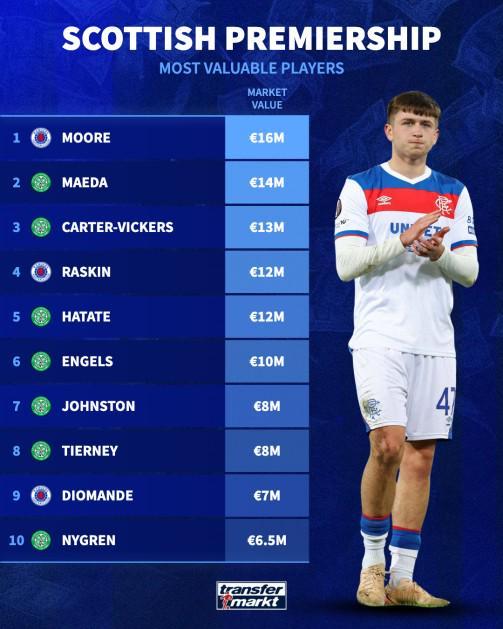 北京时间12月10日,在更新了苏格兰超级联赛的球员身价之后,德转统计出了苏超目前身价排名前10的球员,托特纳姆热刺外租格拉斯哥流浪者的英格兰18岁边锋米凯伊-穆尔以1600万欧元的身价排名第一,凯尔特人的两位日本球星前田大然和旗手怜央上榜。