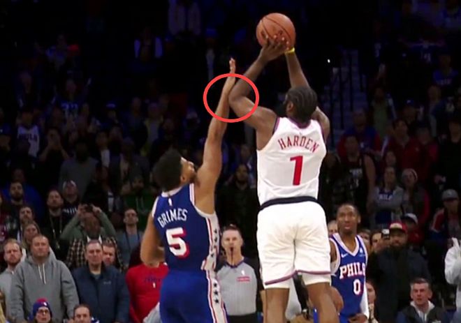 不得不说,这个球引起了巨大的争议,不少球迷认为这肯定是犯规,但裁判并没有把应有的哨吹给哈登。慢镜头显示,格雷姆斯的这次触碰,确实也影响到了哈登的出手。