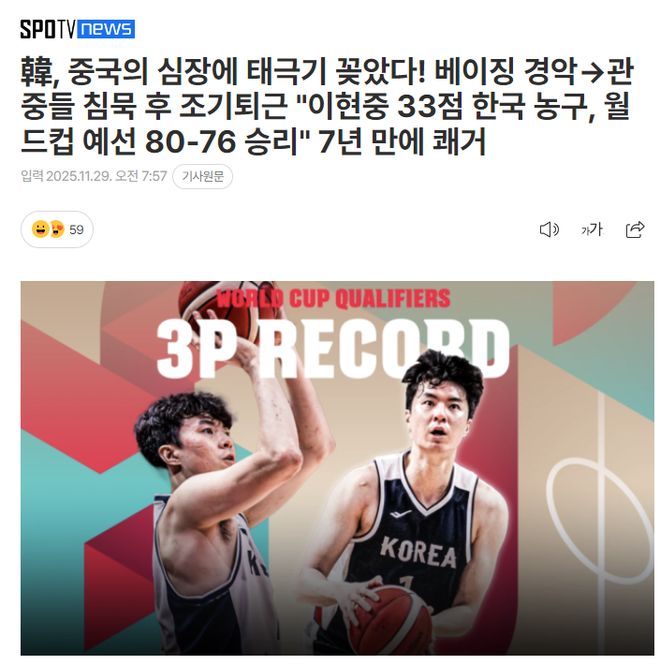 文中写道:这场比赛是韩国队时隔7年再度击败中国队,2018年6月28日,当时韩国队82-74击败中国队,那次是2019年男篮世界杯预选赛,时隔7年全新的韩国男篮在李贤重的带领下做到了。