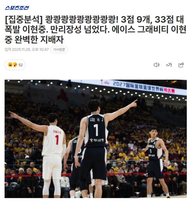赛后多家韩国媒体都为韩国男篮发来贺电:李贤重单场9个三分球大爆发,韩国队时隔七年重新越过中国长城,完美的一场胜利。