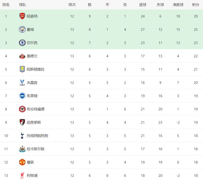 在积分榜上,阿森纳以29分排名榜首。曼城赢球之后,总积分达到25分,升到了第2名。切尔西23分排名第3。第4的是桑德兰,拿到22分。阿斯顿维拉以21分排名第5。水晶宫20分排名第6。热刺只拿到18分,排名第10。纽卡斯尔联、曼联、利物浦和埃弗顿这些球队也都是18个积分。