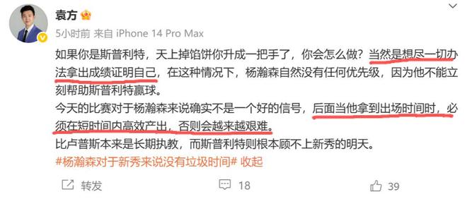 而媒体人袁方也在赛后谈到了杨瀚森的情况,他表示:“如果你是斯普利特,天上掉馅饼你升成一把手了,你会怎么做?当然是想尽一切办法拿出成绩证明自己,在这种情况下,杨瀚森自然没有任何优先级,因为他不能立刻帮助斯普利特赢球。”