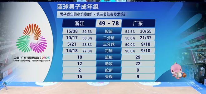 这一节受困于对手的频繁犯规,广东队进攻节奏有所放缓,但立足于强势的防守,也没让浙江队有多少起势,凭借王睿泽徐杰末段的高效输出,广东队单节20-15,三节战罢78-49领先浙江29分。