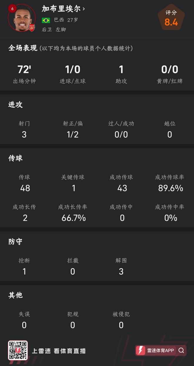 该场对决,加布里埃尔首发出场且出战72分钟,全场3次射门1次射正,攻入1球。传球方面,加布里埃尔全场48次传球(含1次助攻),其中43次传球成功,传球成功率达到89.6%。